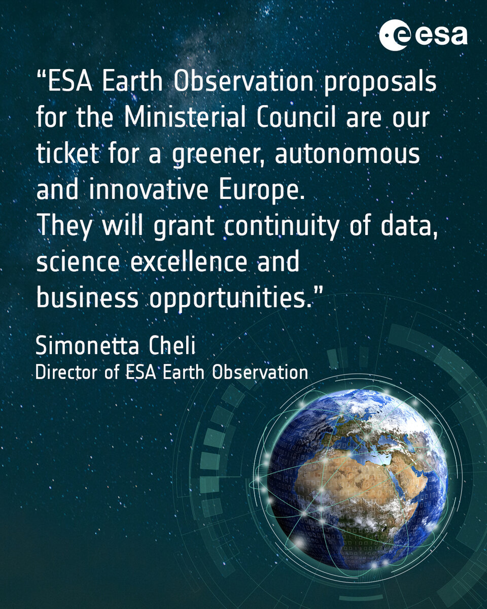 ESA’s Earth observation proposals for CM22 will safeguard and further strengthen Europe’s position in its role of global climate guardian and champion within a growing green economy. Earth observation will keep Europe in front by developing new applications and creating business opportunities in a fast-evolving geo-services sector, all in line with the digital and commercialisation revolution.