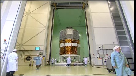 Transfer of the Automated Transfer Vehicle Structural Thermal Model (ATV STM) to the LEAF Acoustic Facility at ESA's test centre, ESTEC, in Noordwijk, The Netherlands (12 December 2001)