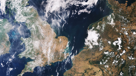 Atmospheric carbon dioxide has been increasing steadily over the years. The map shows leaf area index (depicted in varying shades of green) and chlorophyll concentration. In photosynthesis, chlorophyll absorbs energy to transform carbon dioxide and water into carbohydrates and oxygen.