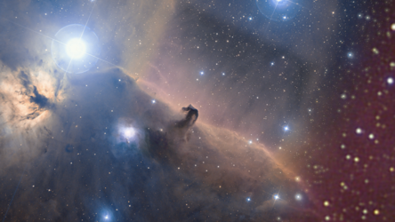 A portion of the image highlighting both the Horsehead and Flame Nebula is also shown in visible light in an image from the Digitized Sky Survey 2 (DSS2). The star Altnitak is indicated – this is the most easterly star in Orion’s famous three-star belt. Several reflection nebulas are also indicated; these host star formation, and like the Horsehead and Flame, are popular targets for astrophotographers.