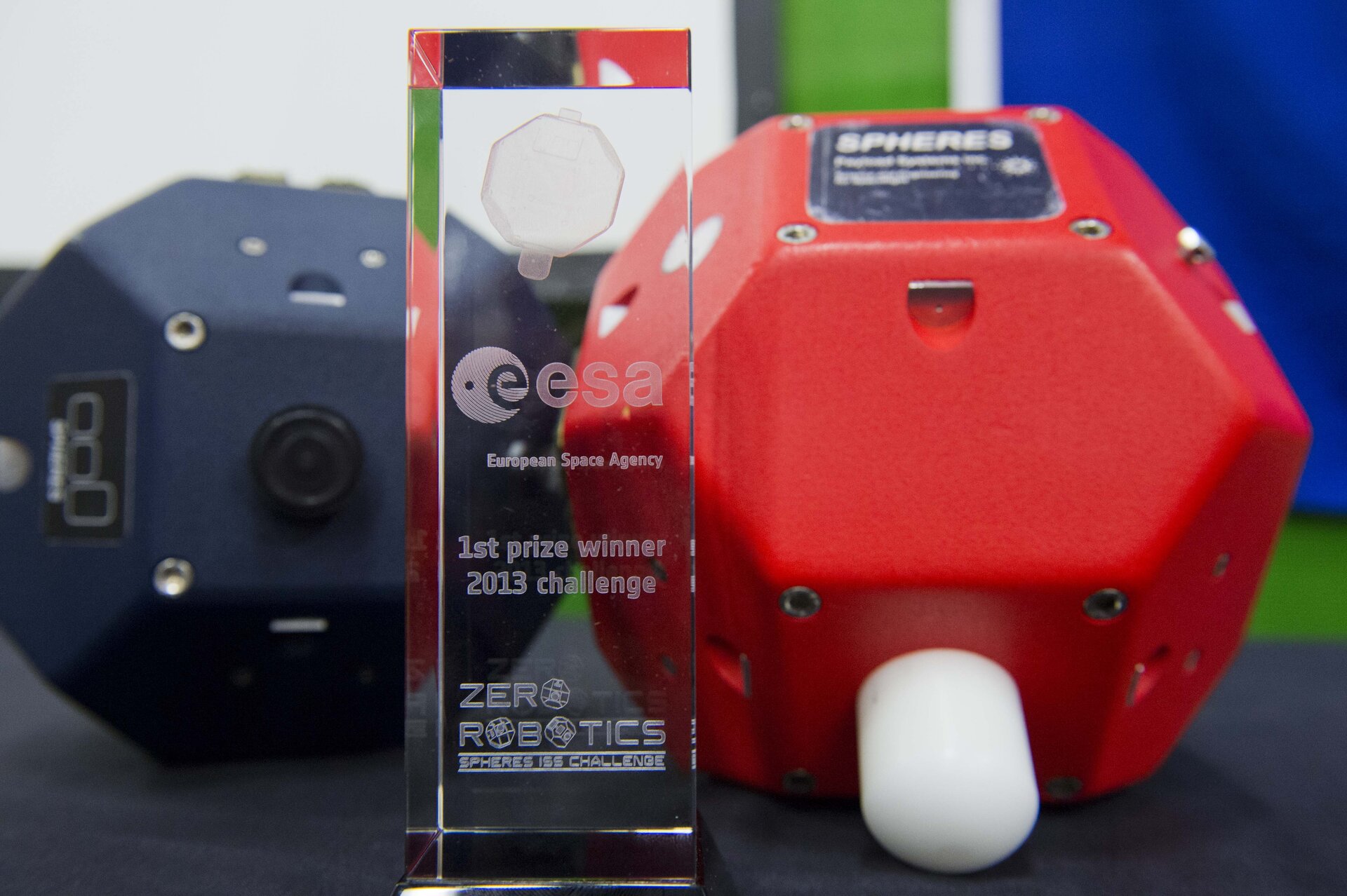 The 2013 Spheres competition trophy backdropped by replicas of the Spheres. The ultimate robot game challenges youngsters to write algorithms to control Spheres, short for Synchronised Position Hold, Engage, Reorient, Experimental Satellites.