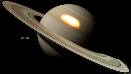 This view is an adjusted composite of two frames taken by the Cassini spacecraft on 14 July 2008. Cassini actually captured the scene from an oblique angle, some 56º below the plane of Saturn’s rings – a far cry from the view directly over the south pole. The orbiter was about 392 000 km from the planet at the time, yet Cassini’s camera still provided a resolution of 2 km per pixel.