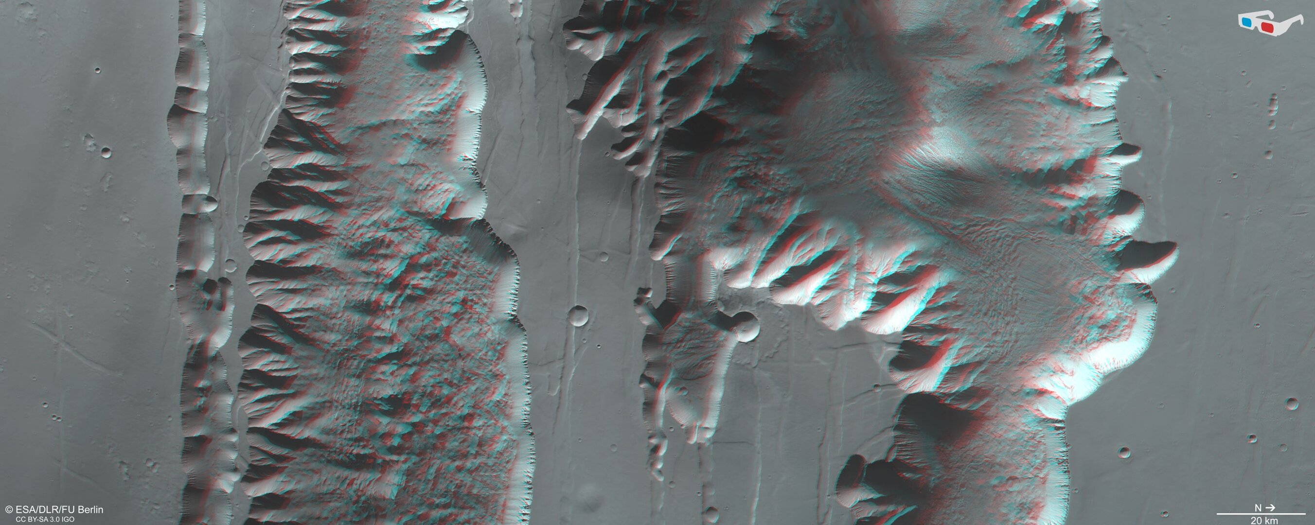 This stereoscopic image shows Ius and Tithonium Chasmata, which form part of Mars’ Valles Marineris canyon structure. It was generated from data captured by the High Resolution Stereo Camera (HRSC) on ESA’s Mars Express on 21 April 2022 during orbit 23123. The anaglyph, derived from data acquired by the nadir channel and one stereo channel of the HRSC, offers a three-dimensional view when viewed using red-green or red-blue glasses.