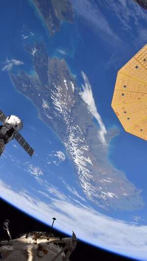 These are icebergs floating in the South Atlantic Ocean, where a group of smaller icebergs surround a much larger piece. Andreas captured this from the International Space Station and was surprised that it was possible to see icebergs from space. The contrast between the white iceberg and the blue ocean definitely helps spotting them as the Space Station flies over.