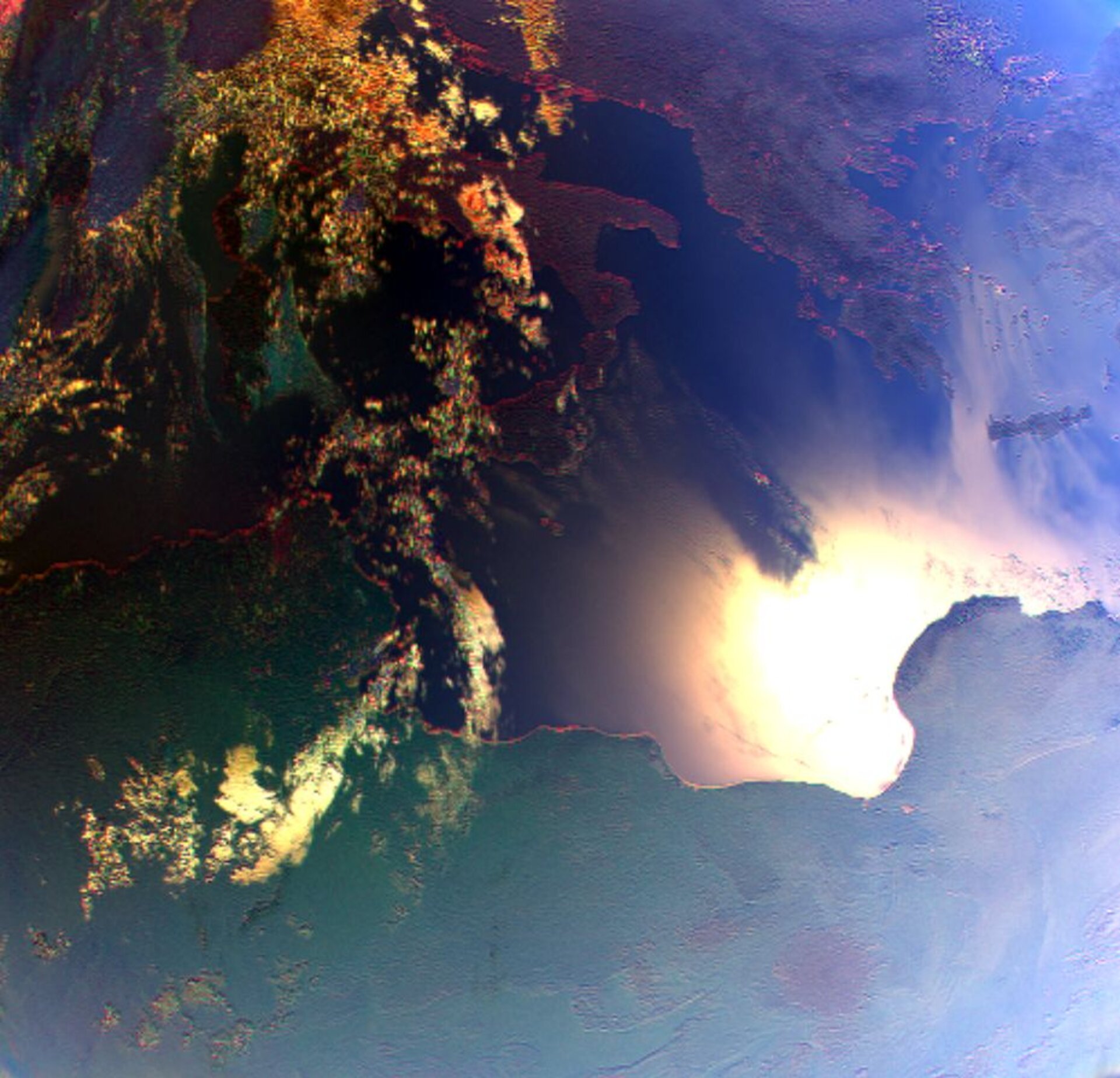 The first images captured by 3MI are a view over Northern Africa, Italy and the eastern Mediterranean, acquired between 10:59 and 11:03 CEST on 28 August. On the left we see a standard view using natural light, highlighting clouds and land surfaces. The image on the right, based on polarised light measurements, reveals much finer detail of the atmosphere’s composition – such as subtle cloud structures over Italy and wildfire smoke on the right edge of the image, near Greece.