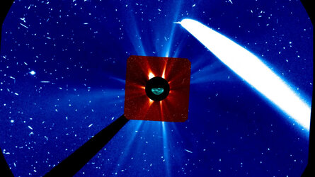 Special thanks to Simeon Schmauß, who processed the raw data to create this impressive video. For comparison, here is a video of the comet with more standard data processing – the comet is so bright that it partially saturated SOHO’s sensor.