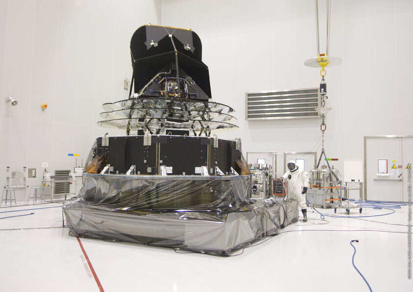 Tests conducted on Planck at Europe's Spaceport in Kourou, French Guiana, have confirmed that the satellite's subsystems work perfectly, and the helium dilution cooler tanks have now been filled. While the final clean-up continues, the solar array has been checked, the satellite has been integrated with its launcher adapter and fuelling is complete.