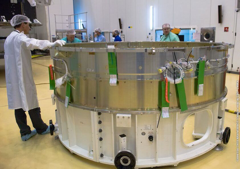 Planck was integrated with its launcher adapter on 1 April. The launcher adapter is a lightweight metal cylinder, 0.32 m high and 2.624 m in diameter, which fixes the satellite to the launch vehicle.